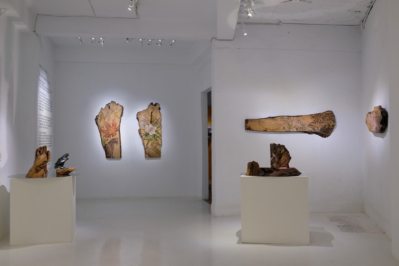 Yang’s painting on wood slab is completely different from the ancient genre of panel painting. He directly paints on raw wood slabs and old, round wooden tabletops from his personal collection. Preserving the irregular shapes of the wood material, together with its original texture and quality, he develops the painting series by observing and following the condition of the material, while incorporating the natural marks created by lightning strikes and gnawing of insects to convert these elements into part of the scenarios and narratives in the series.