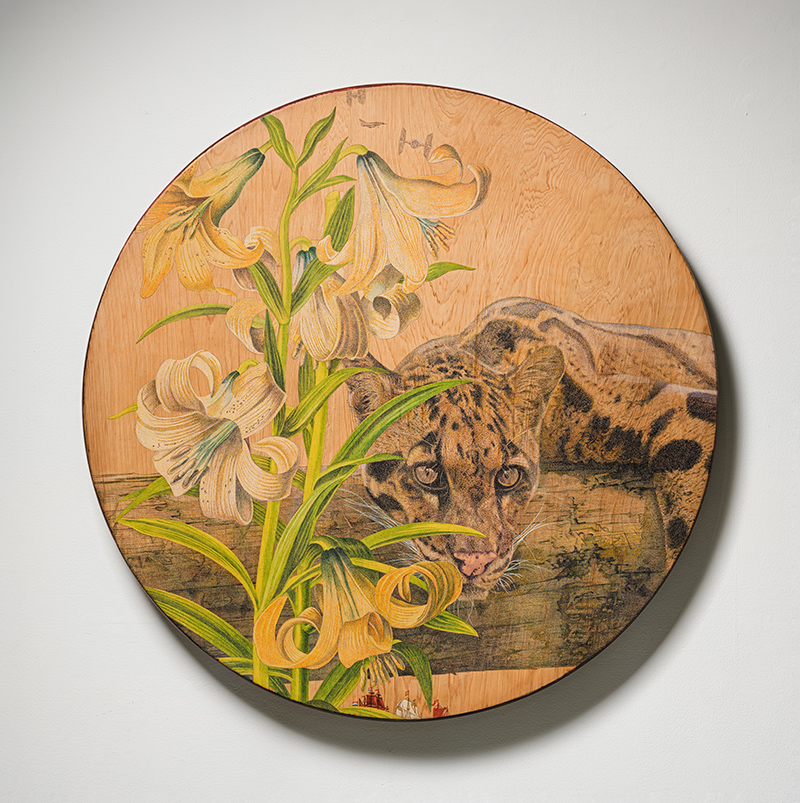 The Lasting Spring.Clouded Leopard, Lily and Zeelandia L2301|mixed media on Taiwan incense cedar|Ø128x3cm|2023