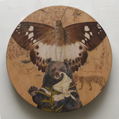 The Lasting Spring.Black Bear, Lily and Butterfly M2301|mixed media on stout camphor|Ø104x3cm|2023